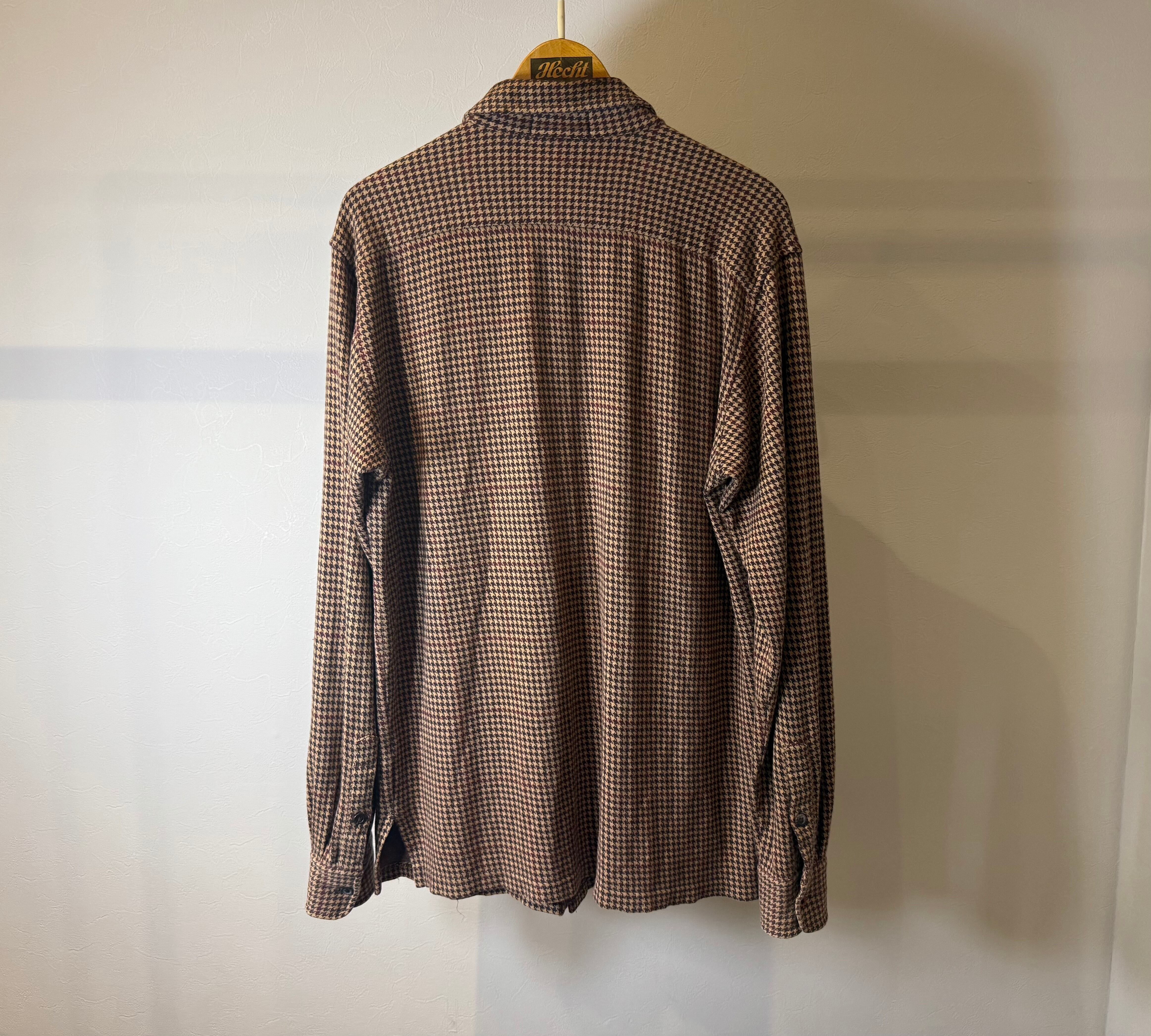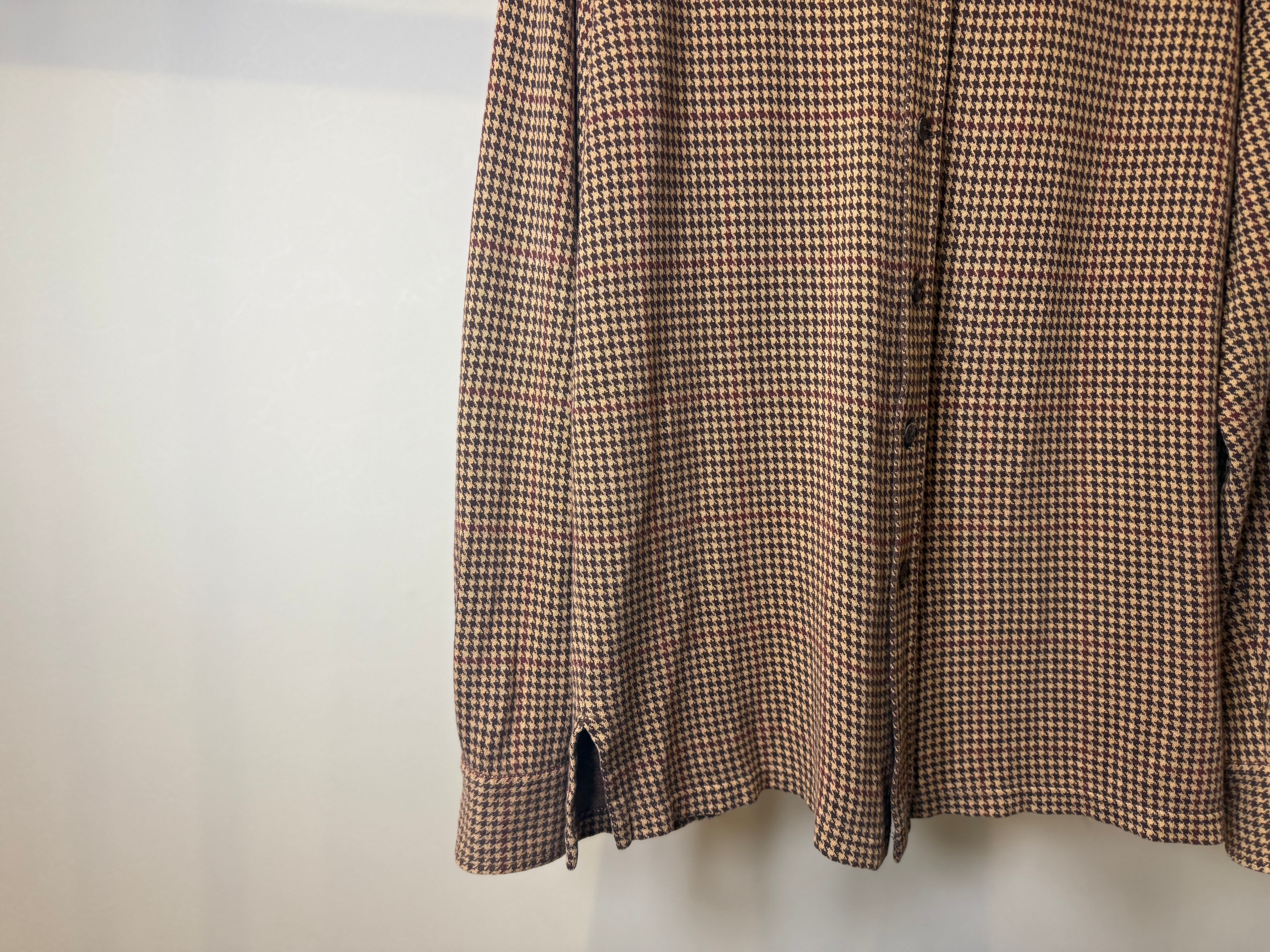 ブラウンベースのハウンドトゥース(千鳥格子柄)が季節感を感じられ、厚すぎず薄すぎない丁度良い素材感です。
